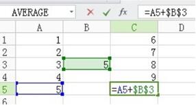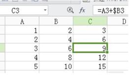 如圖,我們仍然讓第一列+第二列,此時我們輸入公式:“=A1+$B1”,此時我們保證了列是不變的,之后的操作一樣,如果我們輸入公式為:“=A1+B$1”,那么我們就保證了行不變的。