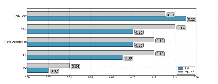 從詞頻得分和語言模式得分兩個方面測算文檔和關鍵詞的相關性,結果發現,標題標簽、Html內容、meta標簽、h1標簽都是高度相關的。