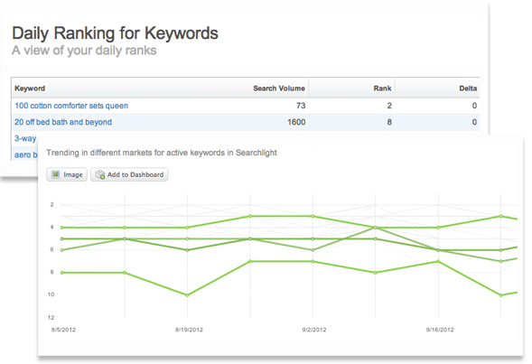 Searchlight提供了關鍵詞、搜索量及排名等的波動信息表。需要監(jiān)控每日關鍵搜索信息波動情況的搜索市場人員,不再需要等待特定數(shù)據(jù)來作決策了。Searchlight提供了他們需要的即時決策的實時信息,并可以不斷的優(yōu)化自然搜索流程,以此來提升流量和增加收入。