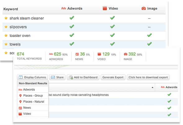 Searchlight通過自然搜索、競價排名,視頻、圖片及新聞等各個角度的統(tǒng)計結果,進行分析。搜索結果提供了大量的新機會,以此來驅(qū)動流量和擴大客戶量。Searchlight提供你這樣的洞察力,通過關鍵詞上的結果,讓你在不同的結果類型中有的機會或競爭力。